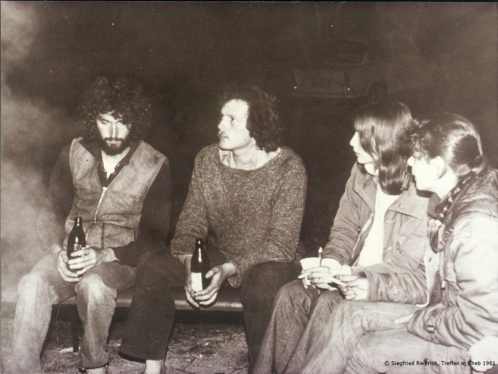 V.l.n.r.: "Rudolf aus Hessen", Siegfried Reiprich, Christine Reiprich und Christine Sturhann am Lagerfeuer an einem Stausee bei Cheb, CSSR, 1981. Das Bild landete in unserer Stasiakte.