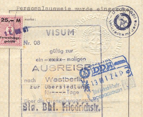 Am 13. August 1981 verließen Christine und ich, nach DDR-Recht "aus der Staatsbürgerschaft entlassen" und damit staatenlos, die DDR über den Grenzübergang in der ostberliner Friedrichstraße, im Volksmund "Tränenpalast" genannt. Das letzte was wir von der DDR sahen, waren die "Kampfgruppen der Arbeiterklasse", die den zwanzigsten Jahrestags des Baus der Berliner Mauer feierten.